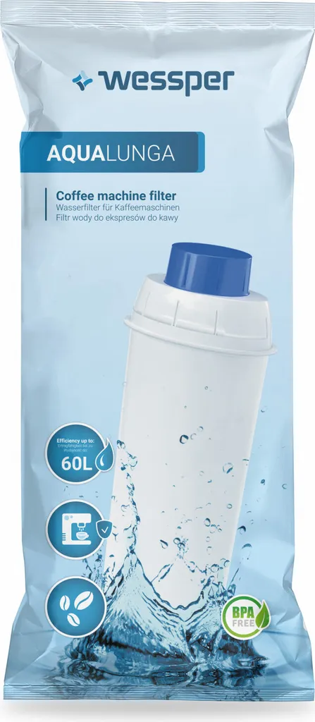 Der Wessper AquaLunga Wasserfilter für ausgewählte DeLonghi Kaffeemaschinen reinigt das Wasser von überschüssigen Sedimenten und verlängert die Lebensdauer der Maschine. Weichen Sie den Filter 5 Minuten lang in Wasser ein, bevor Sie ihn in die Kaffeemaschine einsetzen.