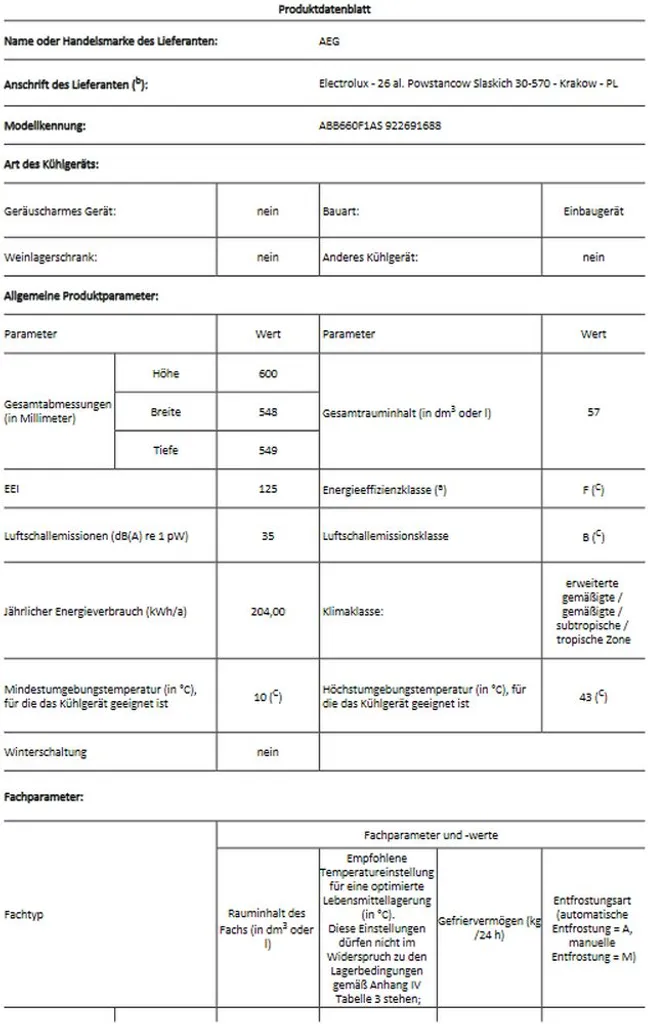 AEG ABB660F1AS. Nutzinhalt Gefrierfach: 57 l, Klimaklasse: SN-T, Gefrierkapazität: 6 kg/24h, Lagerzeit bei Störung: 23 h, Geräuschpegel: 35 dB, Sternekennzeichnung: 4*. Türanschlag: Rechts. , Jährlicher Energieverbrauch: 204 kWh. Produktfarbe: Weiß