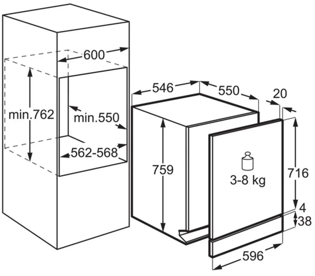 Einbaumaße H(min-max)xBxT (mm): 762-765x550x580