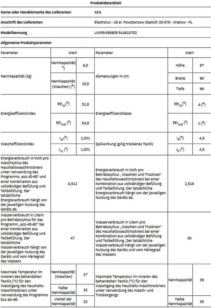 - Dauer des Programms „eco 40-60“ Waschen und Trocknen bei Nennkapazität in Stunden: 9:40