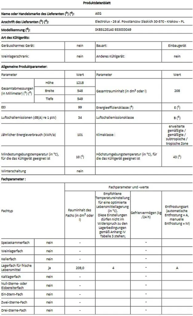 AEG SKB512E1AS. Nutzinhalt Kühlschrank: 208 l, Klimakategorie: SN-T, Geräuschpegel: 34 dB. Kühlschrank – Anzahl der Regale: 4, Anzahl der Gemüsefächer: 1. Lampentyp: LED. Türanschlag: Rechts. Jährlicher Energieverbrauch: 101 kWh, . Gewicht: 35 kg. Produktfarbe: Weiß
