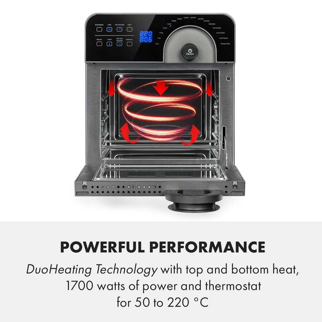 Hier geht es rund: Rotisserie-Funktion mit Drehspieß für knusprig gebratene Hähnchen, Starke Leistung: DuoHeating Technology mit Ober-und Unterhitze, 1700 Watt Leistung und Thermostat für 50 bis 220 °C, Besonders geräumig: großer Innenraum mit einem Volumen von 14 Litern, Einfache Bedienung: übersichtliches digitales Bedienfeld mit Touchscreen, Vielseitig: 16 wählbare Programme für die verschiedensten Gerichte, z.B. Pommes, Fisch, Steak & Kuchen, Komplettset: großes 5-teiliges Zubehörpaket mit Korbzange, Rotisseriespieß, Grillgitter, Gitterkorb und Abtropfblech