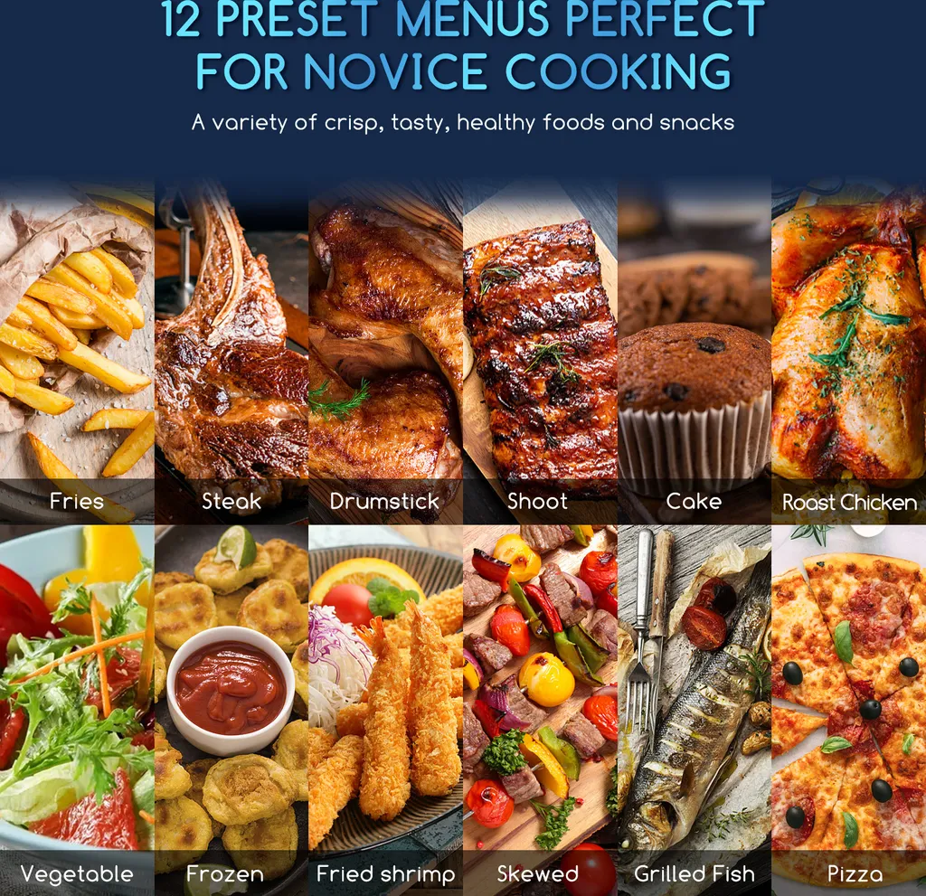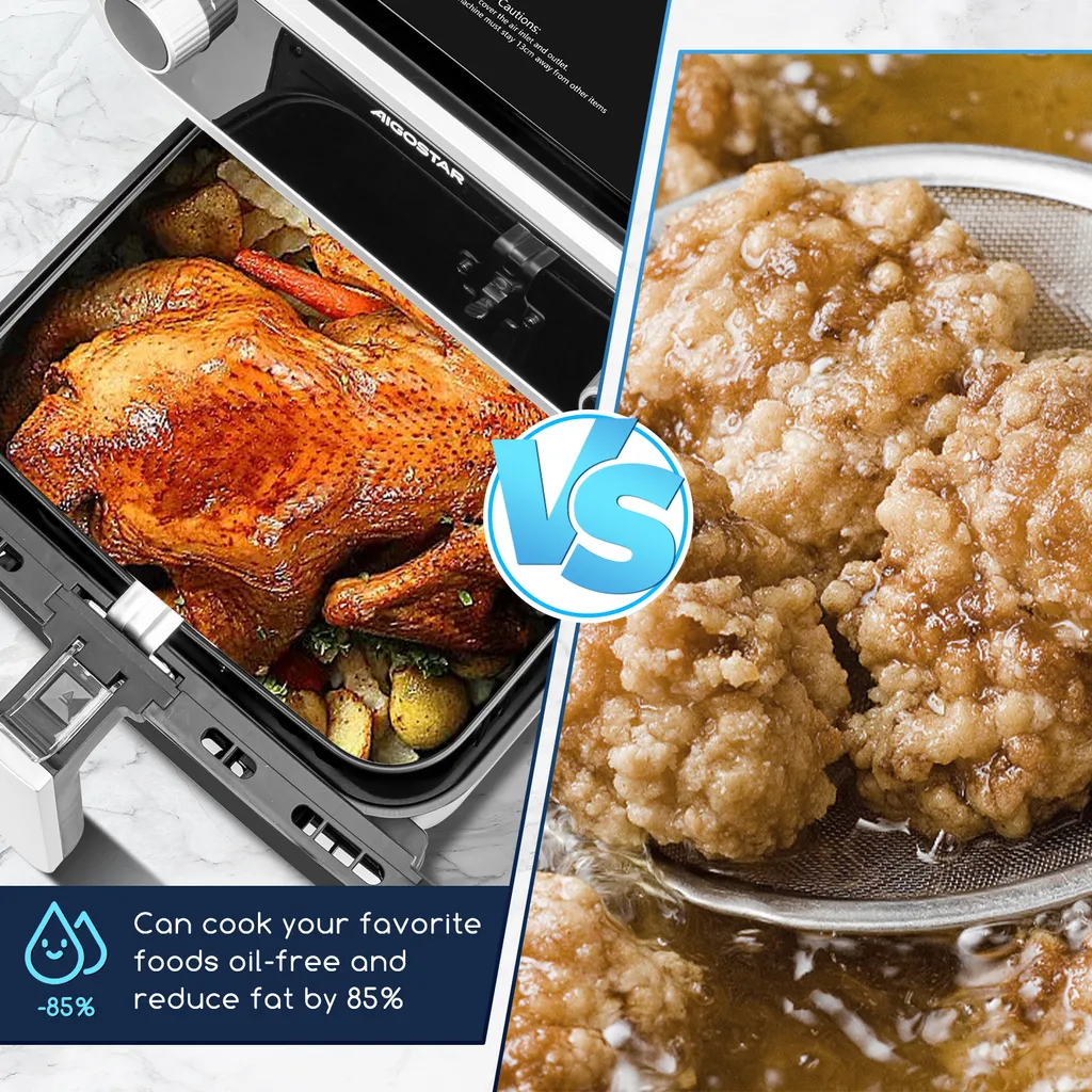 - [Multifunktionale Fritteuse] Aigostar Nicht-Fritteuse ist mit zwei unabhängigen Knöpfen und zwei unabhängigen LED-Anzeigen ausgestattet, wird geliefert mit 12 Programmvoreinstellungen, Ein-Tasten-Kochen intelligente Vorheizen, sie ist mit rutschfesten Füßen uns Kabelrolle ausgestattet,