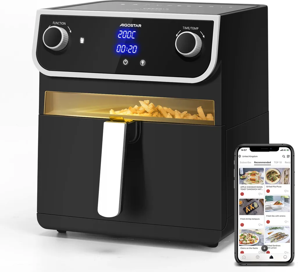 - [Transparentes Sichtfenster] Die neue Fritteuse von Aigostar hat ein einzigartiges Design mit einem transparenten Sichtfenster, das sich sehr gut für Anfänger in der Küche eignet, um köstliche Speisen zuzubereiten. Sie können den Kochstatus durch das Sichtfenster jederzeit überprüfen, ohne sich Gedanken über den Lebensmittelstatus oder andere Bedenken zu machen,