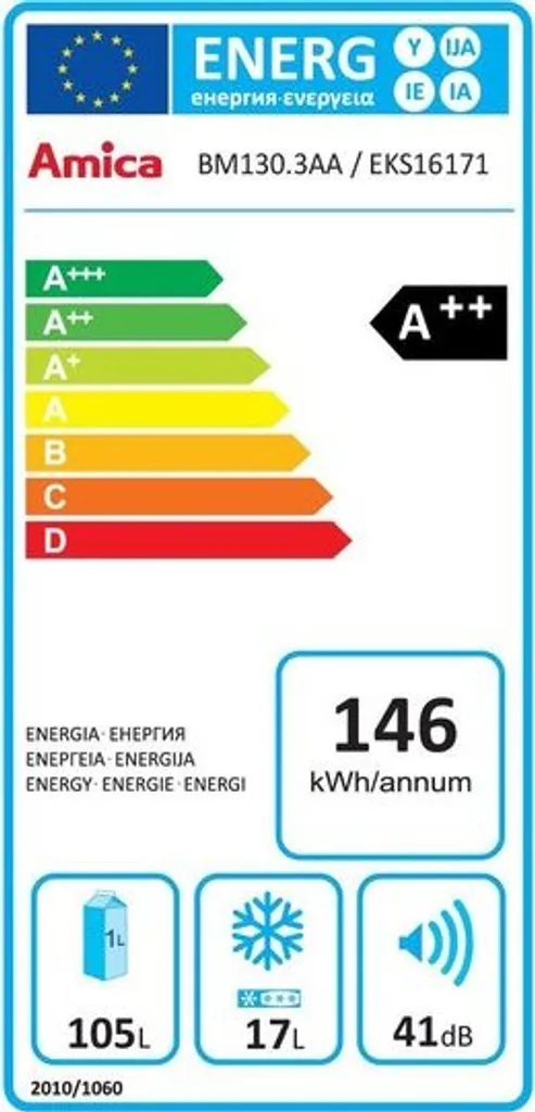 Amica EKS 16171. Geräteplatzierung: Integriert, Produktfarbe: Weiß, Türanschlag: Rechts. Netto Gesamtkapazität: 122 l, Klimakategorie: N-ST, Geräuschpegel: 41 dB. Kühlschrank – Nutzinhalt: 105 l. Gefrierschrankposition: Oben, Gefrierfach – Nettokapazität: 17 l, Gefriervermögen: 2 kg/24h. , Jährlicher Energieverbrauch: 146 kWh, AC Eingangsspannung: 220 – 240 V