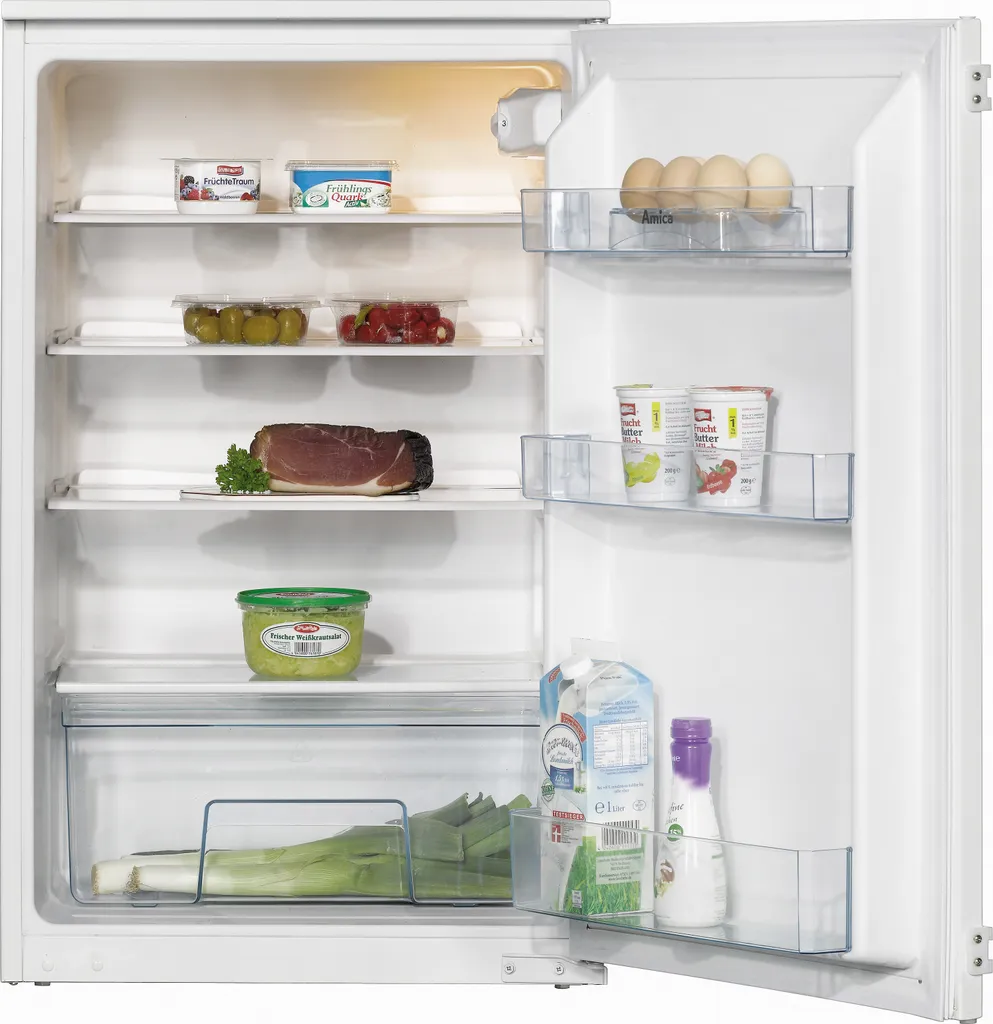 Der weiße Einbaukühlschrank von Amica hat ein Gerätemaß von 87,5 x 54 x 54 cm und passt optimal in eine Nische von 88 cm Höhe. Die Kühlschranktür wird mithilfe einer Schlepptürtechnik montiert. Die vorderen Füße sind höhenverstellbar. Im Lieferumfang sind drei dauerelastische Glasablagen aus Sicherheitsglas mit Vollrahmen, eine Gemüseschale mit Glasabdeckung, LED-Beleuchtung, drei Türablagen und ein Eiertablett enthalten.