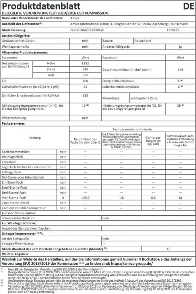 - Laut brummende Haushaltsgeräte können sehr störend sein. Einen Gefrierschrank wie den GS15406w von Amica werden Sie durch seine Betriebslautstärke von nur 40 dB kaum wahrnehmen, wenn Sie sich in seiner Nähe aufhalten. Das super sparsame Gerät mit der verbraucht lediglich 163 kWh Strom jährlich – Ihr Sparschwein wird sich freuen! In dem Gefrierschrank mit 140 Litern Nutzvolumen finden auch tiefgekühlte Lebensmittel für einen Mehrpersonenhaushalt Platz. Aufgeteilt ist dieser Inhalt auf vier geräumige Schubladen und ein Fach mit Klappe.