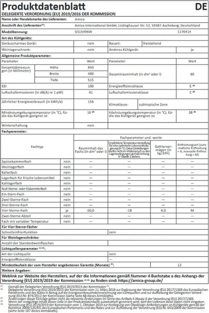 Amica GS 15496 W Tisch-Gefrierschrank 60L 3 Schubladen freistehend ( A bis G)