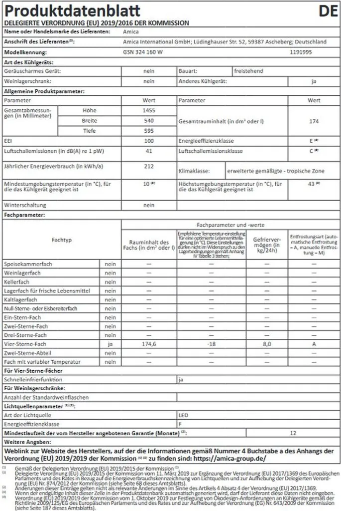 Amica GSN 324 160 W Gefrierschrank 146 cm 174 L NoFrost Holiday-Schaltung (Skala A bis G)