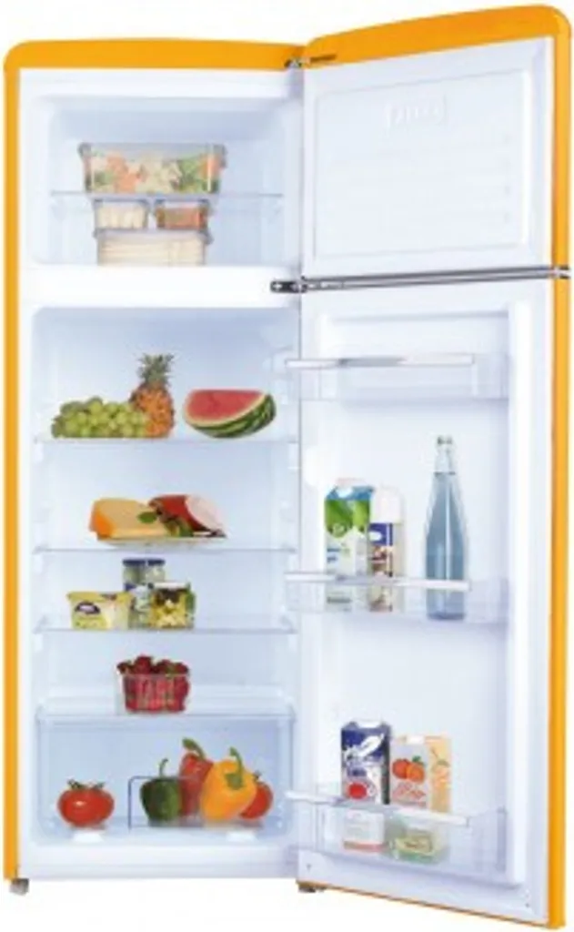 Retro-Kühl-Gefrierkombination, Kühlteil: 3 Glasablagen (Sicherheitsglas), verstellbar,1 transparente Obst/Gemüseschale mit Glasabdeckung, 3 Türablagen, Gefrierteil: 1 Ablage, Gerätegewicht: 41 kg