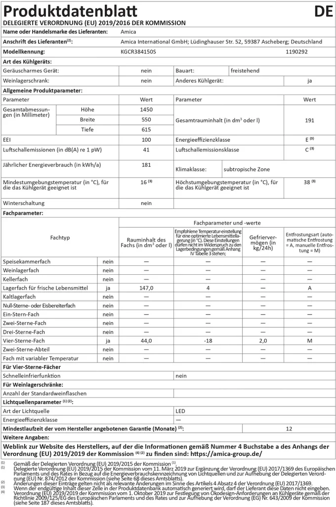 - Geräuschemission in dB(A) und Geräuschemissionsklasse: 41 dB, C