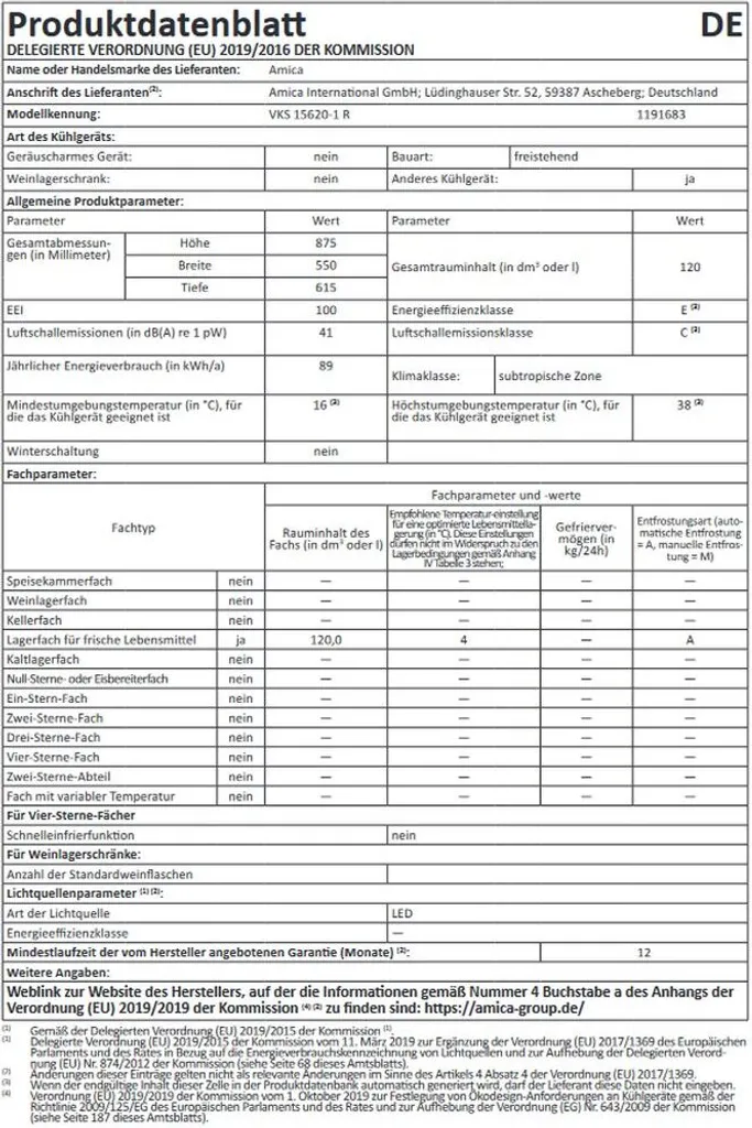 - Nutzinhalt Kühlen / Gefrieren (Liter): 120 / –