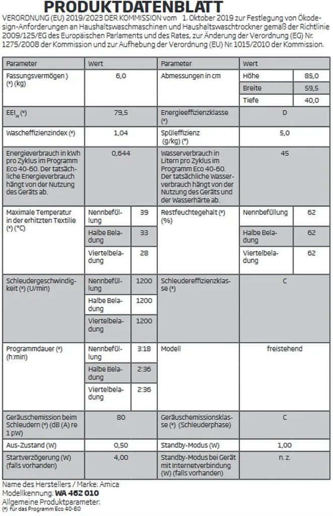 Die WA 462 010 ist eine Waschmaschine von Amica. Darüber hinaus hält die WA 462 010 Waschmaschine folgende Besonderheiten bereit: Selbstreinigung und Selbstreinigungsprogramm. Die Mengenautomatik ist intelligent und umweltschonend. Sie erkennt über Sensoren, wie viel sich in der Trommel befindet und passt die Wassermenge daraufhin automatisch an. Da das Modell über ein Selbstreinigungsprogramm verfügt, hat man mit der Reinigung wenig Aufwand. Dank des integrierten Wasserschutzsystems „Überlaufschutzsystem“ beugt die WA 462 010 Waschmaschine Wasserschäden vor. Mit den Abmessungen von 59,5 cm x 85 cm x 40 cm (BxHxT) vereint die Waschmaschine Form und Funktion auf attraktive Weise. Das Modell wird auch als Slimgerät oder Raumspargerät bezeichnet, da es mit seiner geringen Tiefe von 40 cm relativ wenig Platz benötigt.