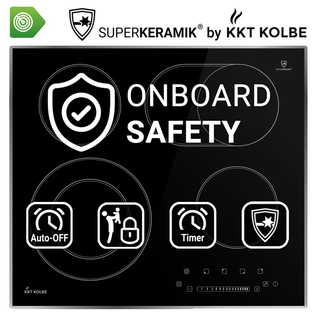 Das KKT KOLBE Heizspiralen-Kochfeld überzeugt durch eine hochwertige Verarbeitung und Funktionalität. Das Kochfeld verfügt über 4 Kochzonen. Die Dual-Kochzone und Bräterzone haben jeweils zwei Kochstellen, so dass Sie den einen zentralen separat und zusammenhängend mit dem jeweiligen äußeren Abschnitt benutzen können. Alle Kochzonen verfügen über 15 Schaltstufen mit der Möglichkeit die Hitze konstant abzugeben. Herkömmliche Intervall- bzw. Heizphasen entfallen somit und Sie können Ihre Lebensmittel gleichmäßig Kochen und Braten. Die Oberfläche aus hochwertiger SUPERKERAMIK®-Glaskeramik sorgt für Qualität und Sicherheit und ist einfach zu reinigen. Das Gerät kann mittels TouchSelect Sensortasten bequem bedient werden. Mit dem Slider des Bedienpanels können Sie mit einem Wisch die Temperaturstufe der Kochplatten einstellen. Mit der Timer-Funktion können Sie Kochzonen zeitgesteuert abschalten. Die LED-Anzeige zeigt alle wichtigen Informationen bequem auf einen Blick. Ein eingebauter Sensor überwacht die Temperatur, um Schäden zu vermeiden. Das Kochfeld schaltet sich dadurch bei zu hoher Temperatur automatisch ab.