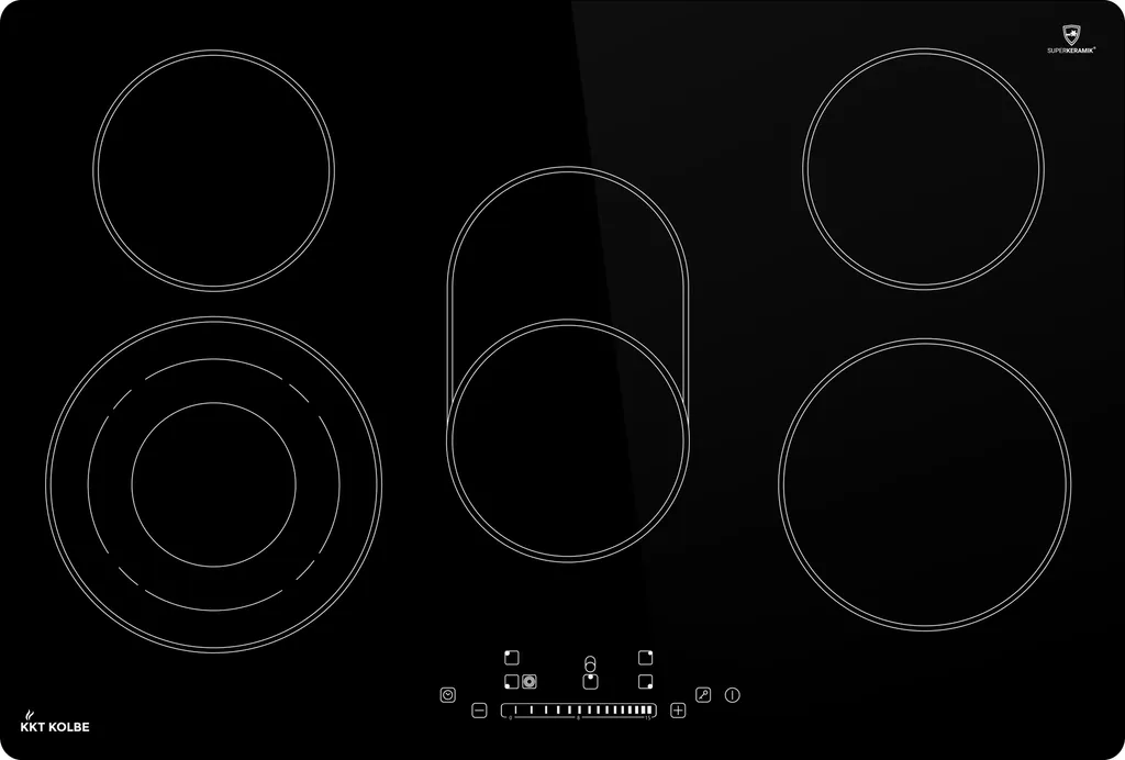 Das KKT KOLBE Heizspiralen-Kochfeld überzeugt durch eine hochwertige Verarbeitung und Funktionalität. Das Kochfeld verfügt über 5 Kochzonen. Die Bräterzone und Dreifach-Kochzone haben jeweils zwei/drei Kochstellen, so dass Sie den einen zentralen separat sowie zusammenhängend mit dem jeweiligen äußeren Abschnitt benutzen können. Alle Kochzonen verfügen über 15 Schaltstufen mit der Möglichkeit die Hitze konstant abzugeben. Herkömmliche Intervall- bzw. Heizphasen entfallen somit und Sie können Ihre Lebensmittel gleichmäßig Kochen und Braten. Die Oberfläche aus hochwertiger SUPERKERAMIK®-Glaskeramik sorgt für Qualität und Sicherheit und ist einfach zu reinigen. Das Gerät kann mittels TouchSelect Sensortasten bequem bedient werden. Mit dem Slider des Bedienpanels können Sie mit einem Wisch die Temperaturstufe der Kochplatten einstellen. Mit der Timer-Funktion können Sie Kochzonen zeitgesteuert abschalten. Die LED-Anzeige zeigt alle wichtigen Informationen bequem auf einen Blick. Ein eingebauter Sensor überwacht die Temperatur, um Schäden zu vermeiden. Das Kochfeld schaltet sich dadurch bei zu hoher Temperatur automatisch ab.