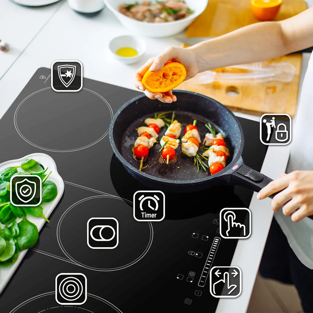 - Kochfelder Details: 2x 1200W Zone 165mm, 2400W (800W+800W+800W) Zone 230mm, 2000W(1100W+900W) Zone 165-270mm,1800W Zone 200mm