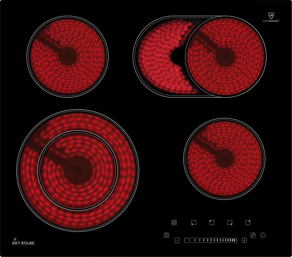 Das KKT KOLBE Heizspiralen-Kochfeld überzeugt durch eine hochwertige Verarbeitung und Funktionalität. Das Kochfeld verfügt über 4 Kochzonen. Die Dual-Kochzone und Bräterzone haben jeweils zwei Kochstellen, so dass Sie den einen zentralen separat und zusammenhängend mit dem jeweiligen äußeren Abschnitt benutzen können. Alle Kochzonen verfügen über 15 Schaltstufen mit der Möglichkeit die Hitze konstant abzugeben. Herkömmliche Intervall- bzw. Heizphasen entfallen somit und Sie können Ihre Lebensmittel gleichmäßig Kochen und Braten. Die Oberfläche aus hochwertiger SUPERKERAMIK®-Glaskeramik sorgt für Qualität und Sicherheit und ist einfach zu reinigen. Das Gerät kann mittels TouchSelect Sensortasten bequem bedient werden. Mit dem Slider des Bedienpanels können Sie mit einem Wisch die Temperaturstufe der Kochplatten einstellen. Mit der Timer-Funktion können Sie Kochzonen zeitgesteuert abschalten. Die LED-Anzeige zeigt alle wichtigen Informationen bequem auf einen Blick. Ein eingebauter Sensor überwacht die Temperatur, um Schäden zu vermeiden. Das Kochfeld schaltet sich dadurch bei zu hoher Temperatur automatisch ab.