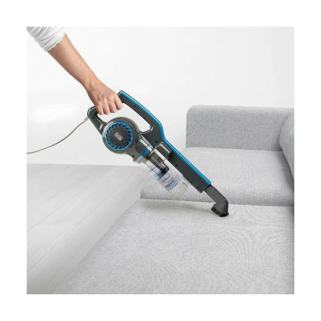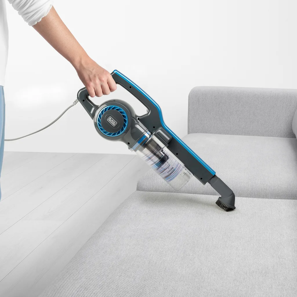 Black + Decker BXVMS600E – 2 in 1. Cyclon Stick-Sauger. 600W Leistung. Handsauger und Bodensauger. 6m Kabellänge. Beutelloses Cyclon Staubtrennsystem. EPA Filter. All-Floor-Bodendüse für alle Oberflächen. Blau.