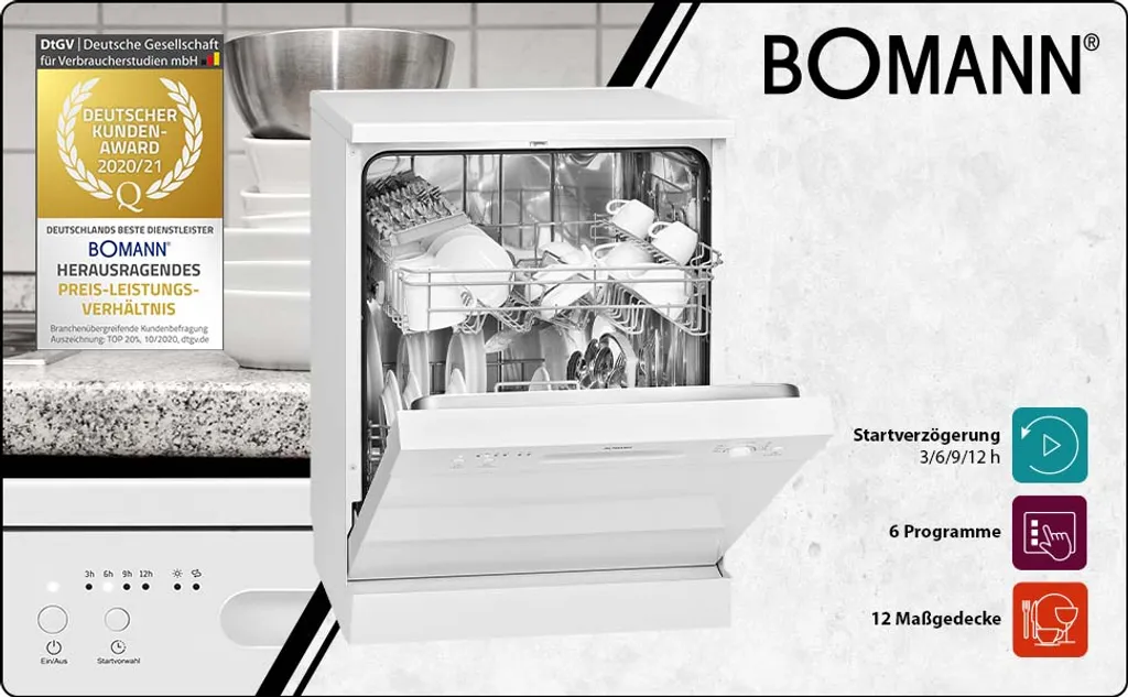 Perfekte Spülergebnisse — Das verschmutzte Geschirr jeden Tag mühevoll per Hand zu spülen muss heutzutage wirklich nicht mehr sein. Bomann unterstützt Sie mit dem Geschirrspüler GSP 7406 bei Ihrem täglichen Abwasch. Der Geschirrspüler bietet viel Platz für Besteck, Teller, Tassen und Gläser (12 Maßgedecke). Wählen Sie aus sechs verschiedenen individuell wählbaren Programmen das Passende für Sie aus.