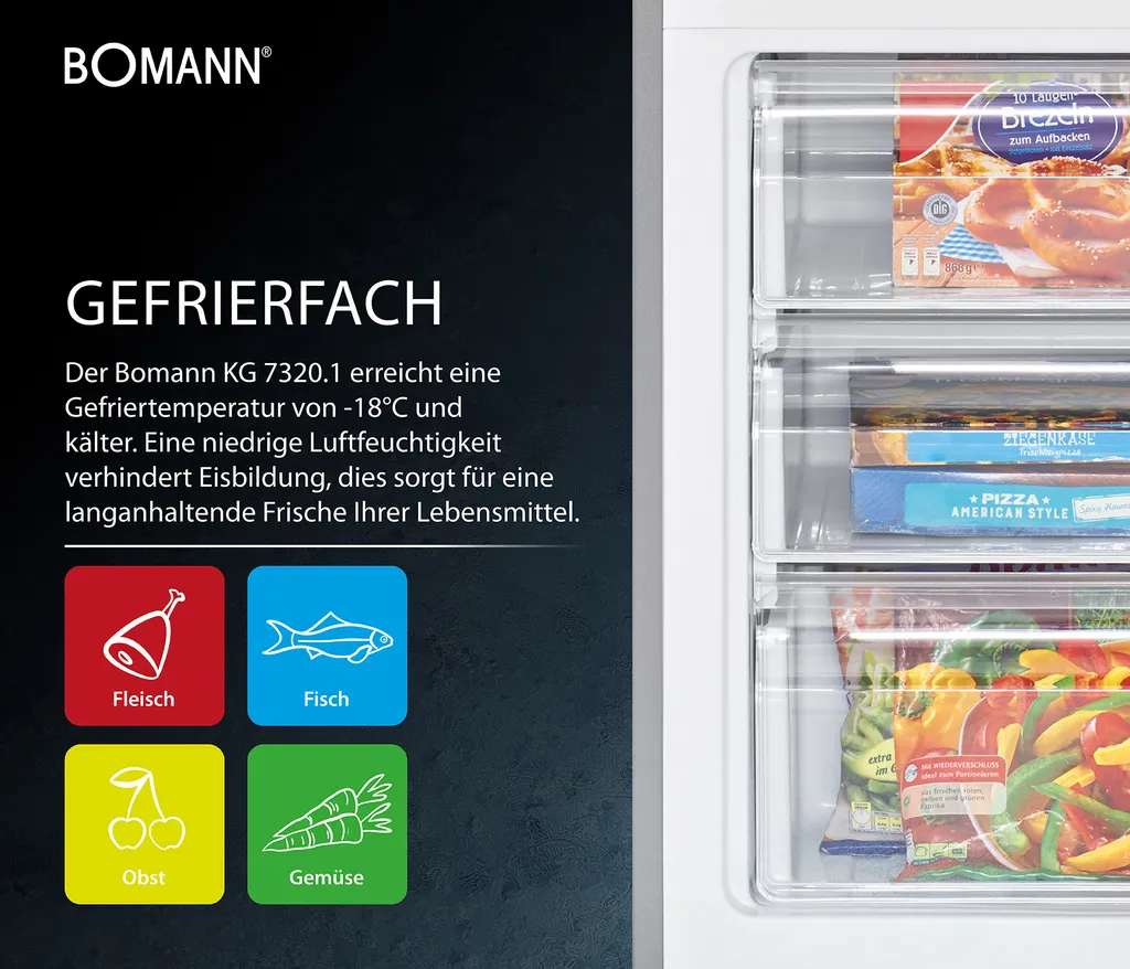 - Fassungsvermögen — Die KG 7320.1 von Bomann hat einen Gesamt-Nutzinhalt von 227 Litern. Davon sind 153 Liter Kühlraum. Der Gefrierraum der Kühl-/Gefrierkombination umfasst 74 Liter.