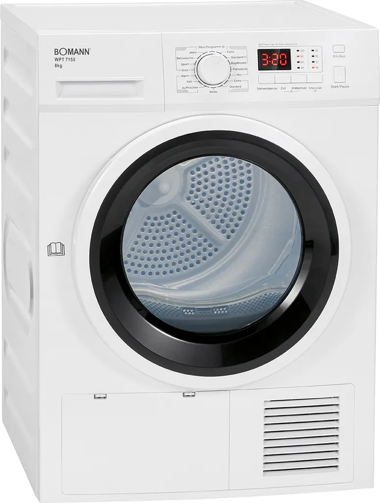 Individuell — Zusätzlich verfügt der WPT 7150 über 3 Zeitprogramme sowie der Zusatzoption Knitterschutz. Weitere Komfort-Ausstattungsmerkmale wie der Überhitzungsschutz, die Kindersicherung, die Restlaufanzeige, die automatische Temperatursteuerung und der Sicherheits-Türverriegelung sind bei Bomann selbstverständlich. Das Gerät informiert Sie zudem wenn der Kondensatbehälter oder der Flusenfilter entleert werden muss.