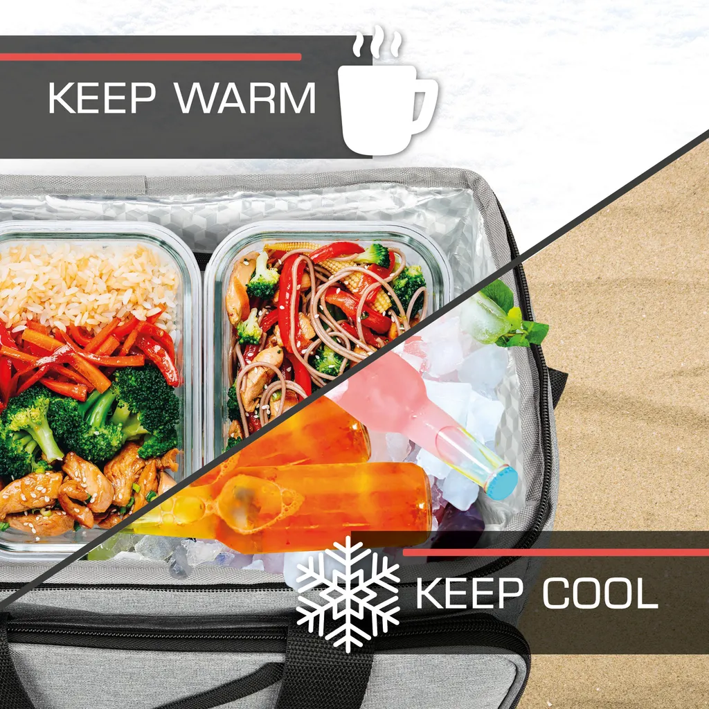 Die Kühlbox hat eine Kapazität von ca. 25 Liter und ist ca. 39x28x29 cm groß. Ein verstellbarer Schulterriemen und ein Tragegriff machen den Transport bequem und leicht.