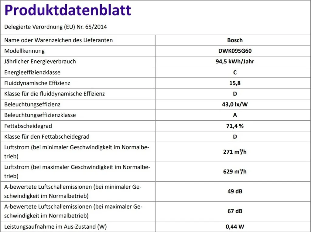 - Geschätzter Jahresverbrauch Strom: 94,5 kWh/annum