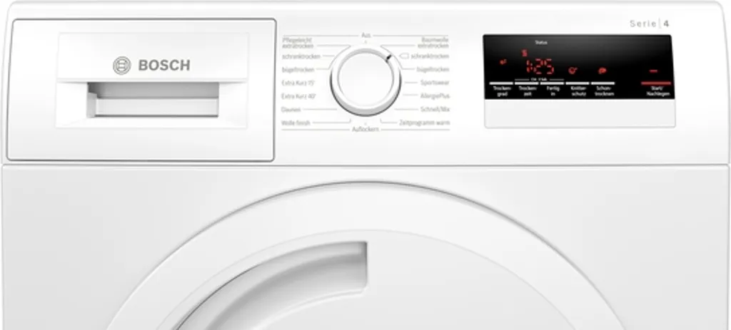 Spezialprogramme: Wolle finish, Schnell/Mix, Zeitprogramm warm, Auflockern, AllergiePlus, Sportswear, Daunen, Extra Kurz 40′, Extra Kurz 15′