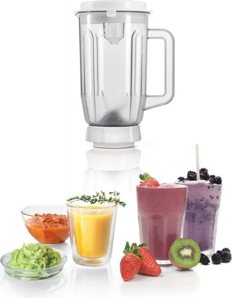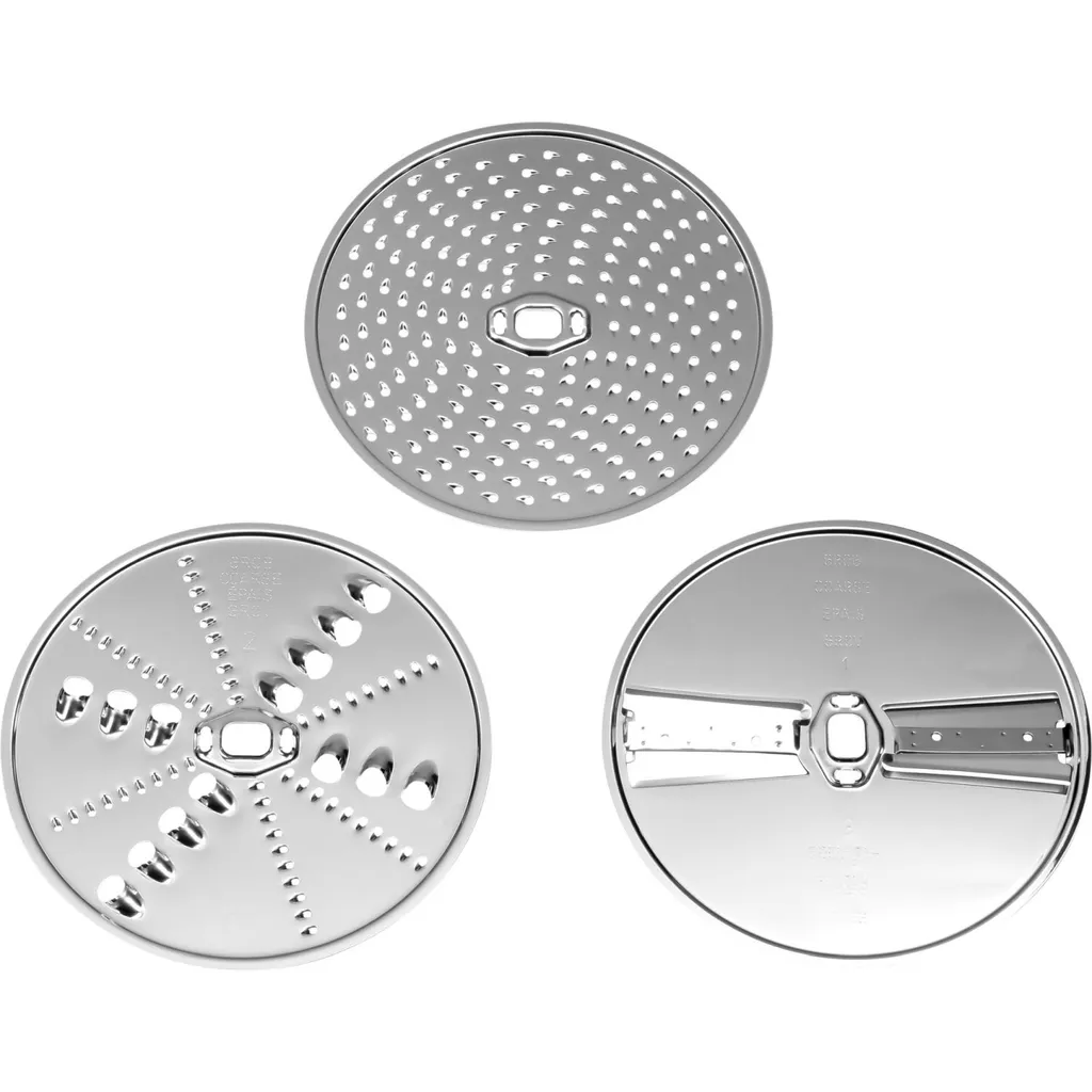 - inkl. 3 Edelstahlscheiben (Schneid-, Raspelwendescheibe, Reibscheibe mittelfein) Mixer-Aufsatz