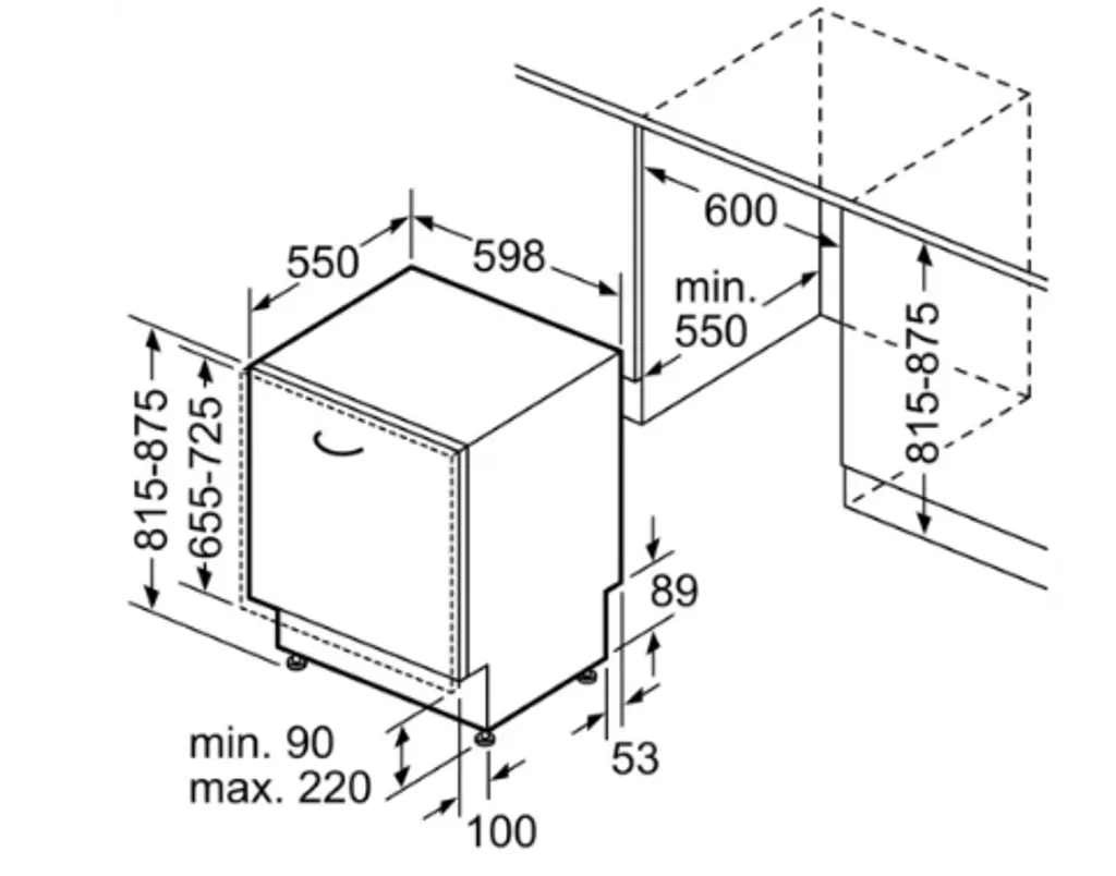 Bosch Serie 2 SGV2ITX48E. Geräteplatzierung: Voll integriert, Produktgröße: Standardgröße (60 cm), Bedienfeld Farbe: Schwarz. Anzahl Maßgedecke: 12 Maßgedecke, Lärmemissionsklasse: C, Geräuschpegel: 46 dB. Höhenverstellbare Füße: 6 cm. , Wasserverbrauch pro Zyklus: 9,5 l, Energieverbrauch pro 100 Zyklen: 92 kWh. Breite: 598 mm, Tiefe: 550 mm, Höhe: 875 mm