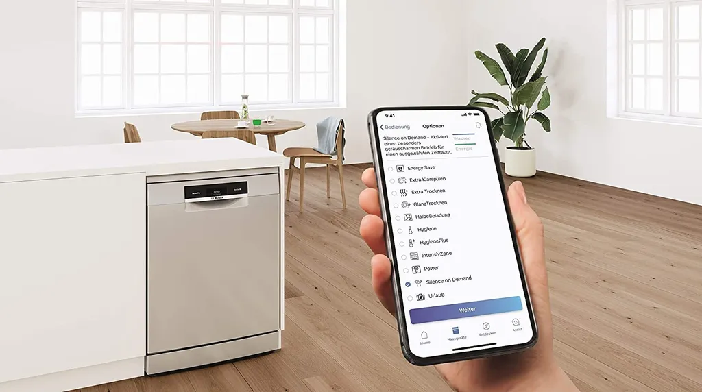 Vernetzter Geschirrspüler der eine Geräuschunterdrückung, zu jeder Zeit über die Home Connect App per Silence on Demand Funktion, möglich macht.