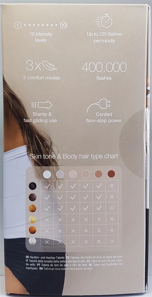 - 400.000 Lichtimpulse(+ 30% verglichen mit dem vorherigen Silk-expert 5) sind äquivalent zu 24 Jahren Anwendung. Die zehn Energie-Level sorgen dafür, dass sich die Intensität der Lichtimpulse an Ihren Hautton anpasst.