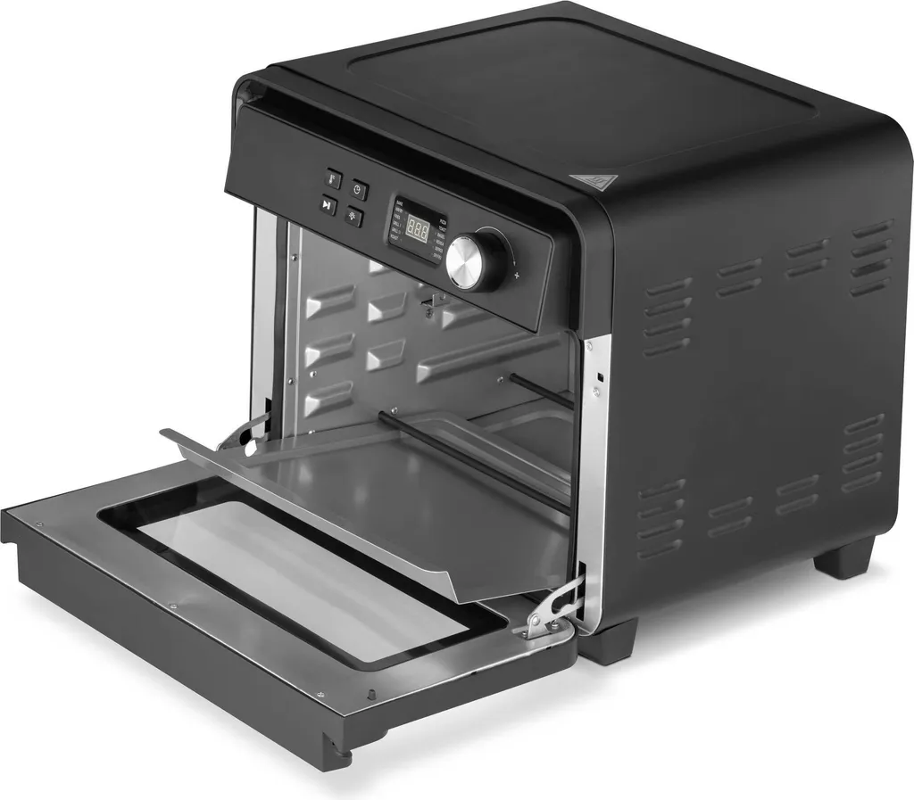 Ein Platzwunder trotz großem 22 L Garraum. Gart auf bis zu 3 Ebenen gleichzeitig – auch große Mengen oder mehrere Speisen gleichzeitig, gesund & fettarm! Grillhähnchen am Spieß, knusprige Pommes in Drehkorb, Backen, Grillen, Auflauf, Aufbacken, Dörr-Programm max. 4 Std. etc. 12 Programme mit extraviel praktischem Zubehör lassen keine Wünsche offen! Einfache Bedienung, die Temperatur ist in 5°C-Schritten von 40° C bis 230° C einstellbar, mit 1-120 Min. Timer, Metallgehäuse, 40,5x35x39 cm, 1.700 Watt.