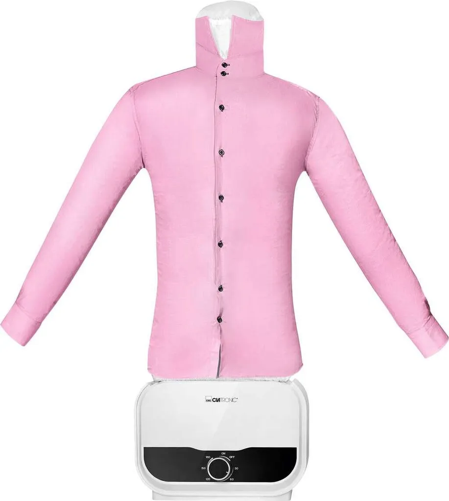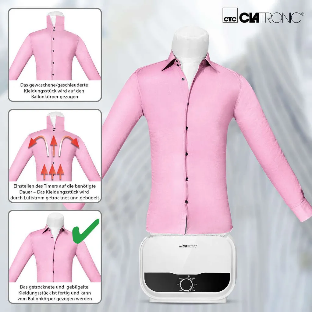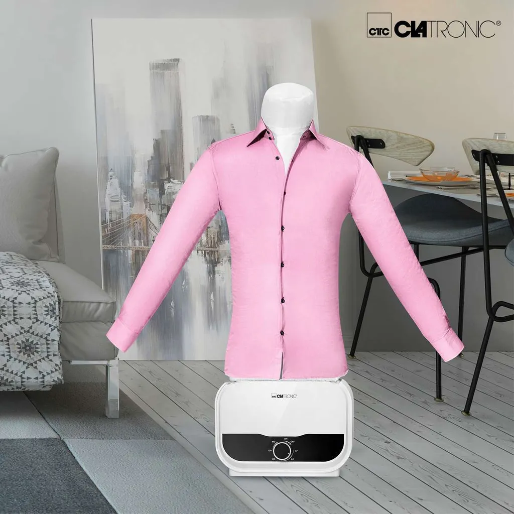 Ihre Kleidung ohne Knitterfalten mit Clatronic: Wenn Sie nicht gerne bügeln oder Zeit sparen wollen, bietet Ihnen Clatronic die automatische Bügel- und Trockenpuppe. Der Aufbau dauert nur wenige Minuten, und Sie können Ihr Hemd frisch aus der Waschmaschine auflegen, den Rest erledigt die Bügelpuppe. Sie können sie auch für Hemden und sogar Hosen verwenden, da sie ein spezielles Zubehör dafür enthält. Sie müssen sich keine Gedanken mehr darüber machen, ob Ihr Lieblingshemd morgen noch trocken ist, jetzt liegt es an Ihnen. Außerdem neutralisiert es unangenehme Gerüche.