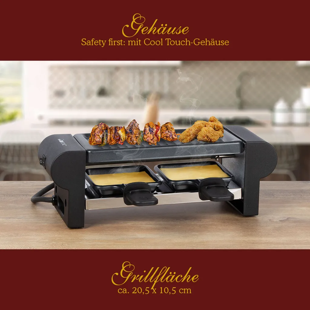 Maximaler Genuss zu Zweit – Grillen und genießen, deftig oder gesund – mit dem eleganten und hochwertig verarbeiteten Raclette-Grill von Clatronic.