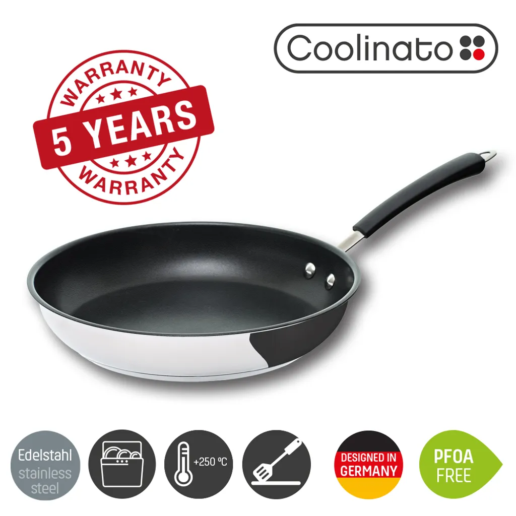 Auch wenn Sie kein Profikoch sind, darf das Allround-Talent, die Bratpfanne, in Ihrer Küche nicht fehlen! Mit den beschichteten Edelstahlpfannen von Coolinato gelingt jedem das perfekte Spiegelei, ohne zusätzliches Fett und ohne anbrennen.