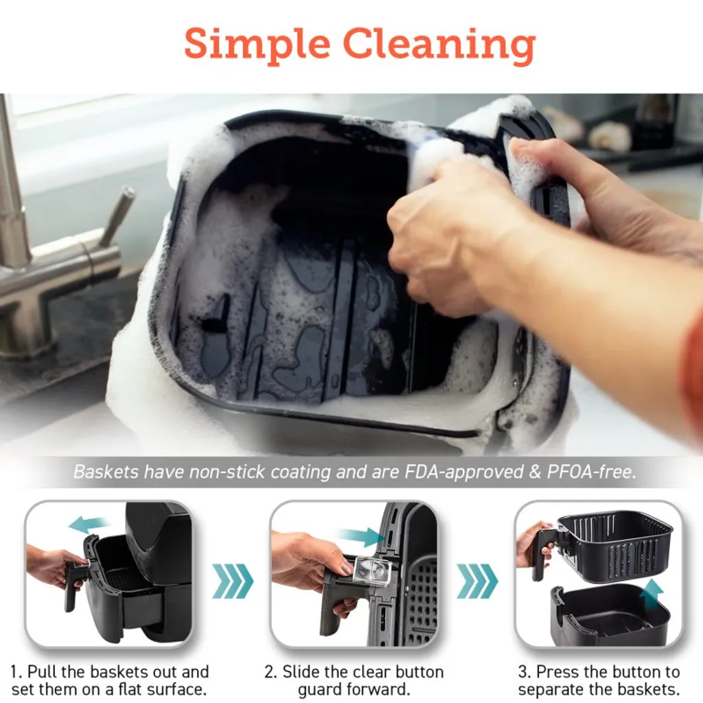 Abnehmbare Antihaft-Frittierkörbe wirken spülmaschinenfest. Cool-Touch Griff und Korb-Entriegelungsknopf vermeiden Verbrennungsgefahr sowie ungewolltes Ablösen. Überhitzungsschutz und Automatische Abschaltung für sichere Verwendung. PFOA-frei, BPA-frei. COSORI original-Zubehörsatz für Heißluftfritteusen ist ebenfalls erhältlich (suchen nach: C158-6AC).
