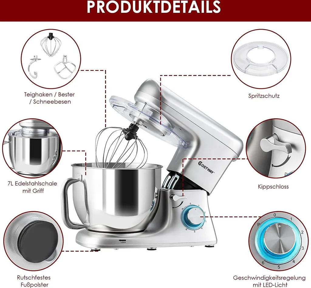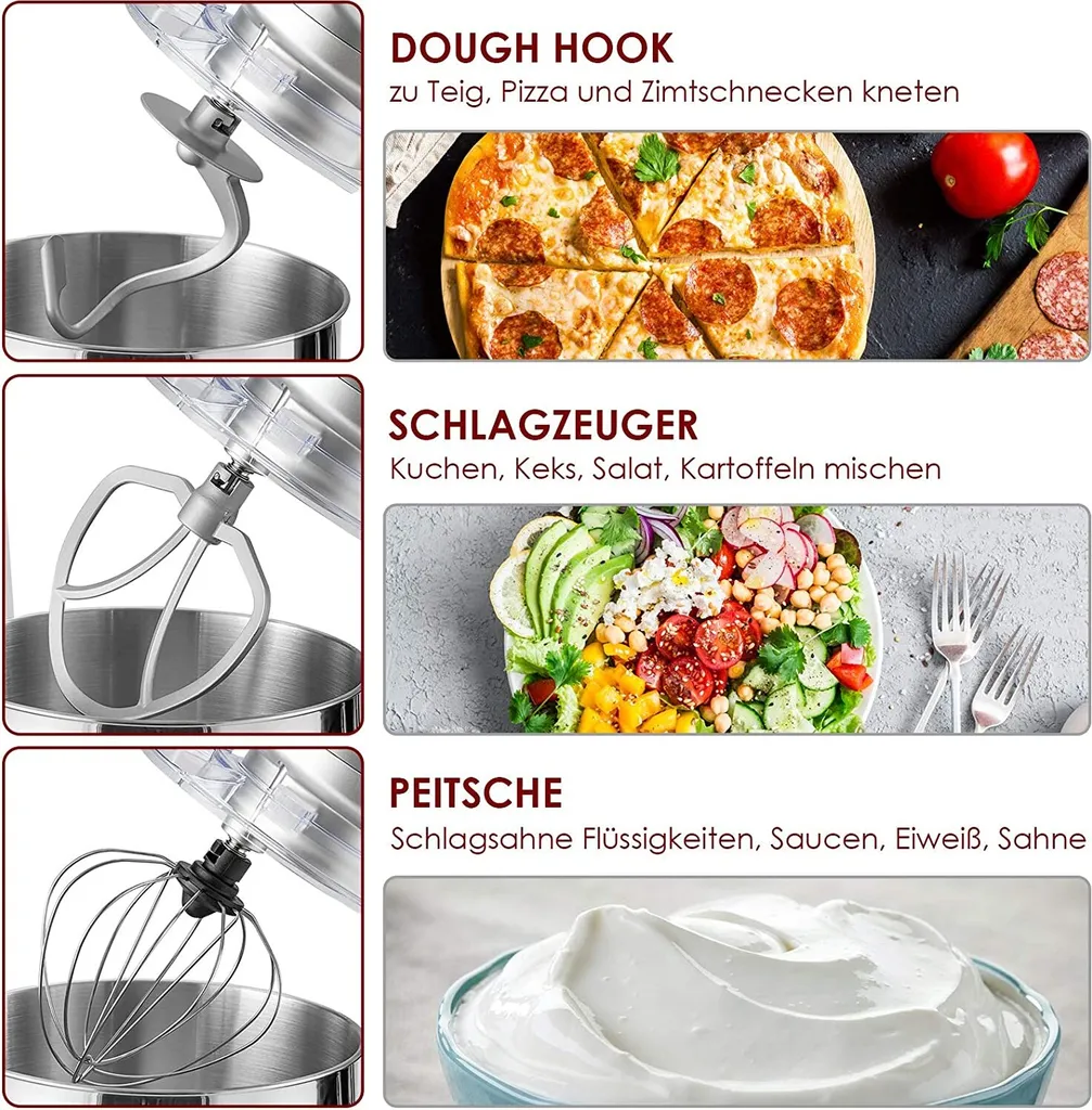 Wenn Sie nicht viel Energie und Zeit für das Kneten von Teig aufwenden möchten, kann unsere Küchenmaschine Sie entlasten. Die 6 Geschwindigkeiten sind geeignet für viele Rezepte. Das Kipp-Design macht es einfach, die Rührschüssel und die Aufsätze abzunehmen. Der leistungsstarke und leise Motor erledigt die Mixarbeiten gut, ohne andere zu stören. Durch den Überhitzungs- und Überlastungsschutz ist dieser Küchenstandmixer zweifellos sicher in der Anwendung. Die 7-Liter-Edelstahl-Rührschüssel hat nicht nur viel Fassungsvermögen, sondern ist auch langlebig und praktisch. Mit dem Knethaken, dem Quirl und dem Schneebesen kann dieKüchenmaschine verschiedene Küchenanforderungen erfüllen.