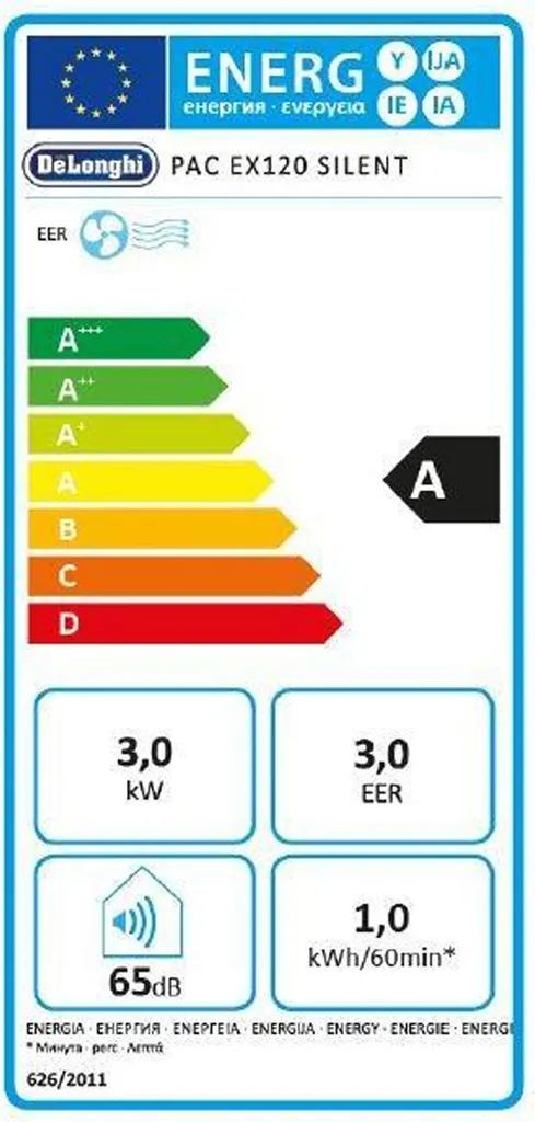 DeLonghi PAC EX120 SILENT. Energie-Effizienzklasse (Kühlung): A, AC-Eingangsspannung: 220-240 V, AC-Eingangsfrequenz: 50-60 Hz. Farbe des Produkts: Schwarz, Displaytyp: LCD. Breite: 445 mm, Tiefe: 390 mm, Höhe: 805 mm