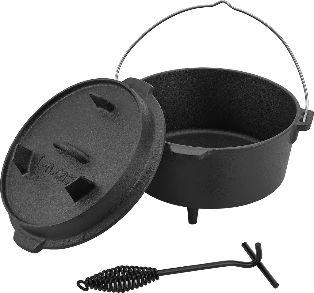 Der Kochtopf aus Gusseisen ist ein Multifunktionstalent und lässt sich bspw. als Schmortopf, Gulaschkessel oder Brotbacktopf verwenden. Glut, glühende Kohlen oder Grillbriketts können direkt auf dem Deckel oder unter dem Topf platziert werden. Der Dutch Oven ermöglicht ein gleichmäßiges Garen und verfügt darüber hinaus über einen Deckelheber.
