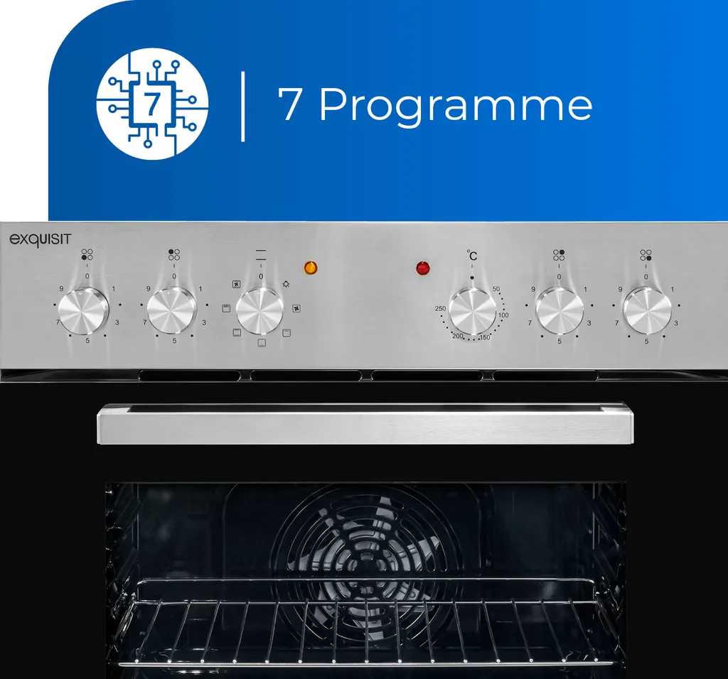 Funktional und praktisch: So ist das Einbauherd-Set EHE 156-2.1 U-Set in der Farbe Inoxlook. Das Gerät besitzt die Energieklasse A (Skala Energieeffizienzklasse A+++ bis D). Die Abmessungen des Einbauherds betragen 59,5 x 59,5 x 51,0 cm (Höhe/Breite/Tiefe). Das Kochfeld selber besitzt die Maße 6,8 x 58,0 x 51,0 cm (Höhe/Breite/Tiefe). Das Gerät passt sich als Einbaugerät nahtlos in Ihre exisiterende Küchenzeile ein. Das Kochfeld hat 4 Kochplatten, die Sie separat steuern können. Die Restwärmeanzeige zeigt Ihnen deutlich an, welche Kochzone heiß ist und verhindert auf diese Weise schmerzhafte Verbrennungen. Der Backofen bietet Ihnen ein Garraum-Volumen von 59 Liter – reichlich Platz für die Zubereitung Ihres Gebäcks oder Speisen. Die Temperatur lässt sich im Bereich 50 – 250 °C regeln.Insgesamt 7 Funktionen stehen zur Selektion zur Verfügung. Hierzu gehören: Ober- und Unterhitze,Oberhitze,Unterhitze,Grillfunktion,Umluft, und mögliche Kombinationen einzelner Funktionen. Selbst bei schlechten Lichtverhältnissen behalten Sie Dank der hellen Backofenbeleuchtung den Überblick.