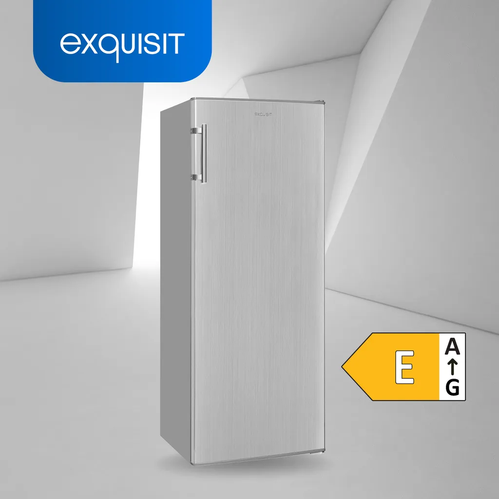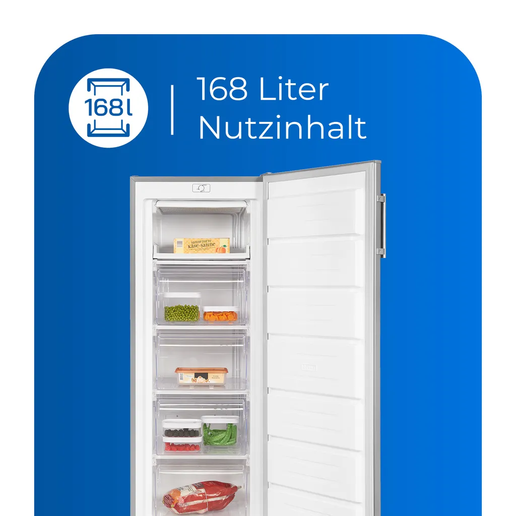 Der Gefrierschrank bietet reichlich Platz für sorgenfreies Lagern über einen längeren Zeitraum. Insgesamt stehen Ihnen 168 l Nutzinhalt zur Verfügung. Das Gerät in der Farbe Edelstahloptik hat die Abmaße 142,6 x 54,4 x 57,1 cm (Höhe/Breite/Tiefe) und hat die Energieeffizienzklasse E (Skala Energieeffizienzklasse A bis G). Durch seine freistehende Bauart lässt es sich an jedem Ort aufstellen und in Betrieb genommen werden. Der wechselbare Türanschlag sorgt hierbei für noch mehr Flexibilität beim Aufstellen. Der 4*-Gefrierbereich verfügt über eine Kapazität von 168,0 l und bietet den idealen Ort für Eis, Tiefkühlpizza und alles andere.