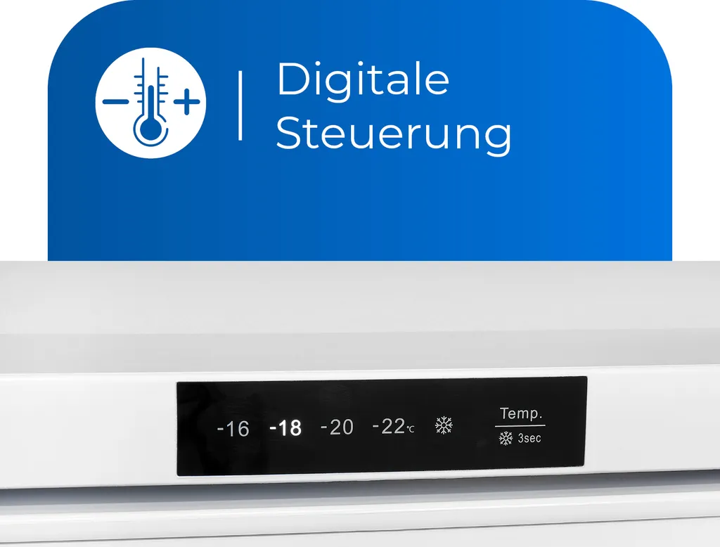 Der Gefrierschrank bietet reichlich Platz für sorgenfreies Lagern über einen längeren Zeitraum. Insgesamt stehen Ihnen 85 l Nutzinhalt zur Verfügung. Das Gerät in der Farbe Weiß hat die Abmaße 85,0 x 56,0 x 57,5 cm (Höhe/Breite/Tiefe) und hat die Energieeffizienzklasse D (Skala Energieeffizienzklasse A bis G). Durch seine freistehende Bauart lässt es sich an jedem Ort aufstellen und in Betrieb genommen werden. Der wechselbare Türanschlag sorgt hierbei für noch mehr Flexibilität beim Aufstellen. Der 4*-Gefrierbereich verfügt über eine Kapazität von 85,0 l und bietet den idealen Ort für Eis, Tiefkühlpizza und alles andere. Eine spezielle Schnell-Gefrierfunktion sorgt dafür, dass Ihre Lebensmittel in kürzester Zeit eingefroren werden. Mit der digitalen Temperaturanzeige haben sie jederzeit die gewählten Einstellungen im Blick. Über ein gut lesbares Display haben Sie die gewünschte Temperatur jederzeit im Blick und können bequem einzelne Funktionen des Gerätes steuern.