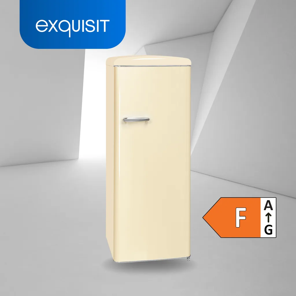 Das Retro-Kühlgerät bietet ein hohes Maß an Funktionalität und jede Menge nützliche Features. Mit dem Vollmetallgriff lässt sich das Gerät angenehm öffnen und hält sich optisch an den trendigen Retro-Look. Insgesamt stehen Ihnen 229 l Nutzinhalt zur Verfügung. Das Gerät hat die Abmaße 144,0 x 54,5 x 57,5 cm (Höhe/Breite/Tiefe) und hat die Energieeffizienzklasse F (Skala Energieeffizienzklasse A bis G). Durch seine freistehende Bauart lässt es sich an jedem Ort aufstellen und in Betrieb genommen werden. Das Gerät bietet Ihnen über 229,0 l Nutzinhalt in seinem Kühlbereich, welcher mit Hilfe von teilweise verstellbaren Ablagen praktisch unterteilt ist. Das Gemüsefach hält dabei Obst und Gemüse allzeit knackig und frisch. Damit Sie auch bei schlechten Lichtverhältnissen zielsicher an Ihre Lebensmittel gelangen, bietet Ihnen das Gerät eine Beleuchtung.