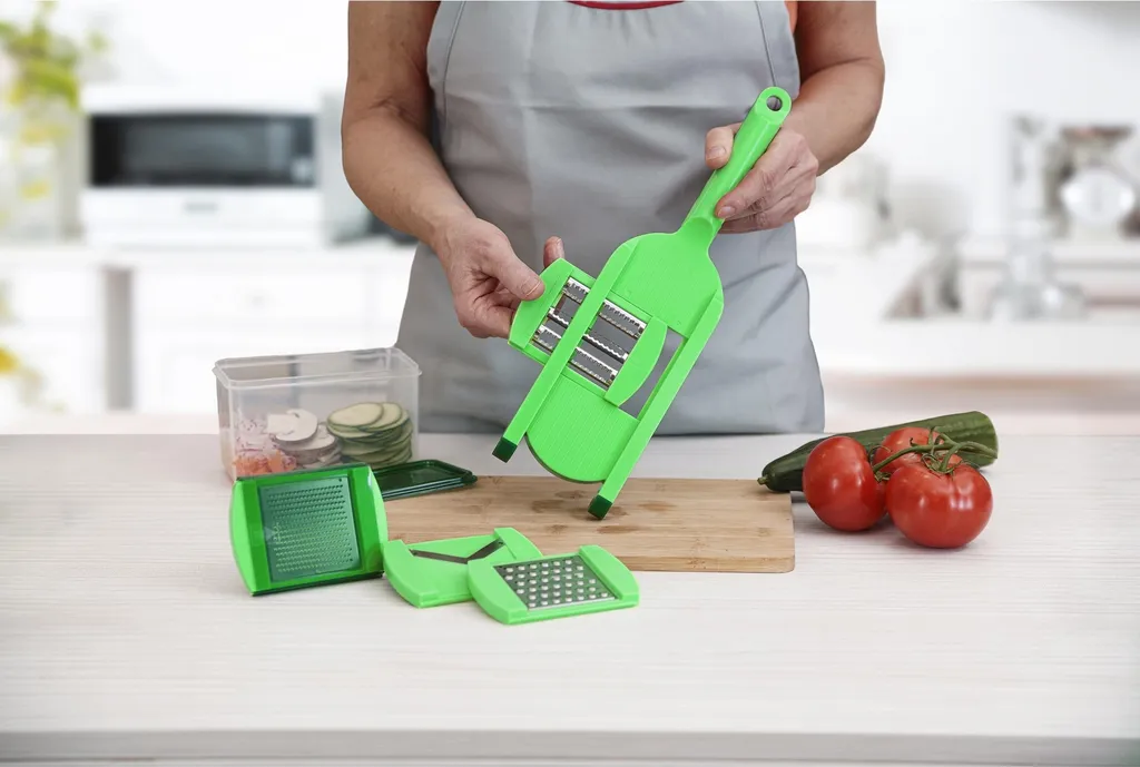 - Gemüseschneider, Parmesanreibe, Juliennereibe, Scheibenschneider, Käsereibe, Nussreibe, Zwiebelschneider, Raspel etc. in einem Gerät!