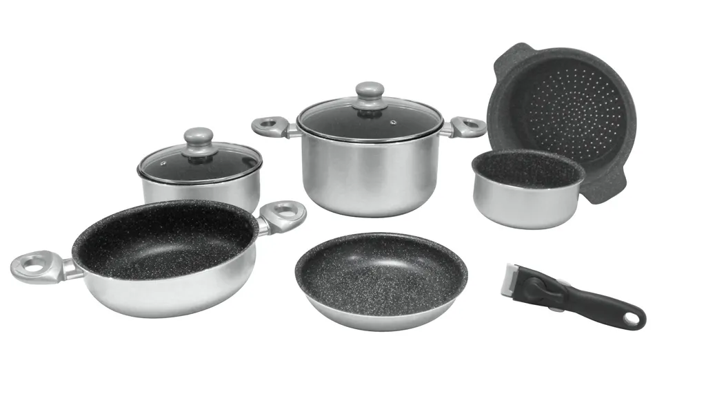 Hochwertiges Aluminium Kochset mit Antihaftbeschichtung und Induktion. Alle Artikel sind aus hochwertigem Material verarbeitet. Der abnehmbare Griff hat eine Sicherheitsverriegelung, um ein ungewolltes Öffnen zu verhindern.