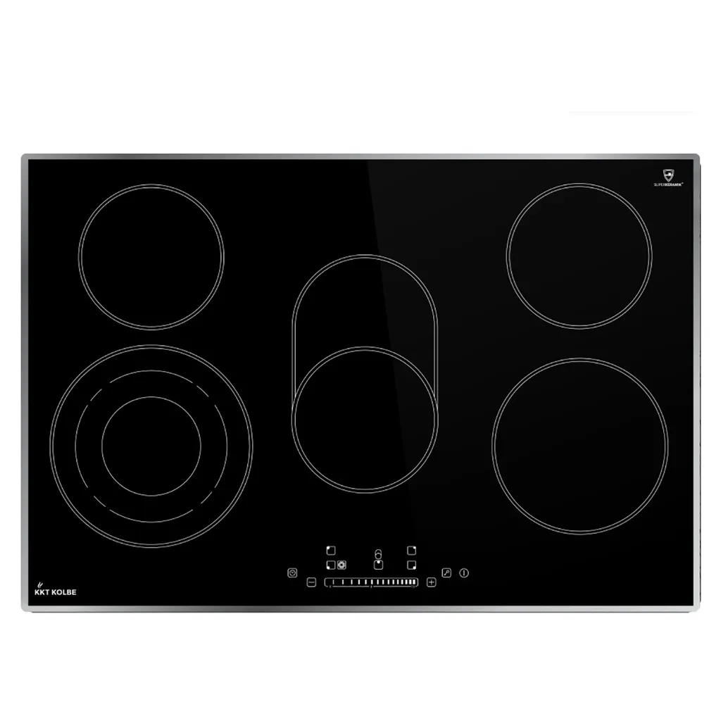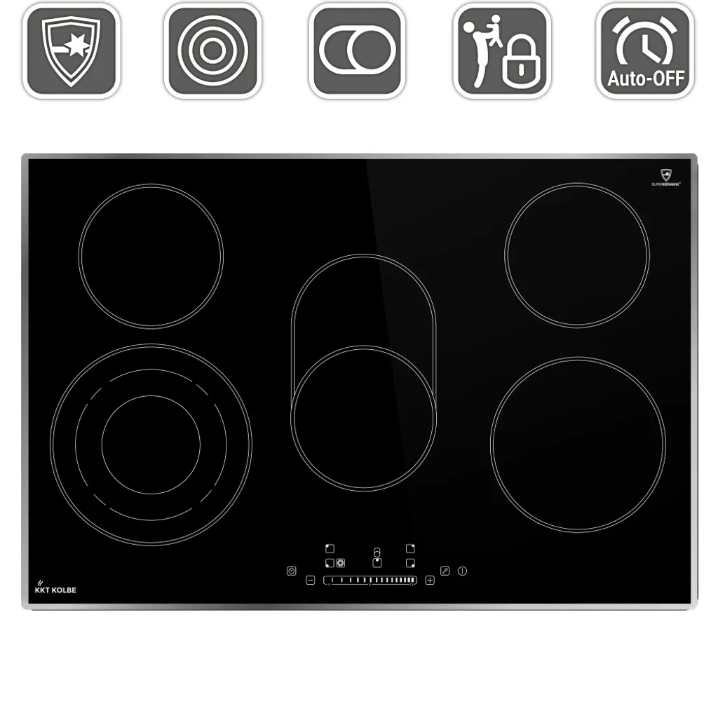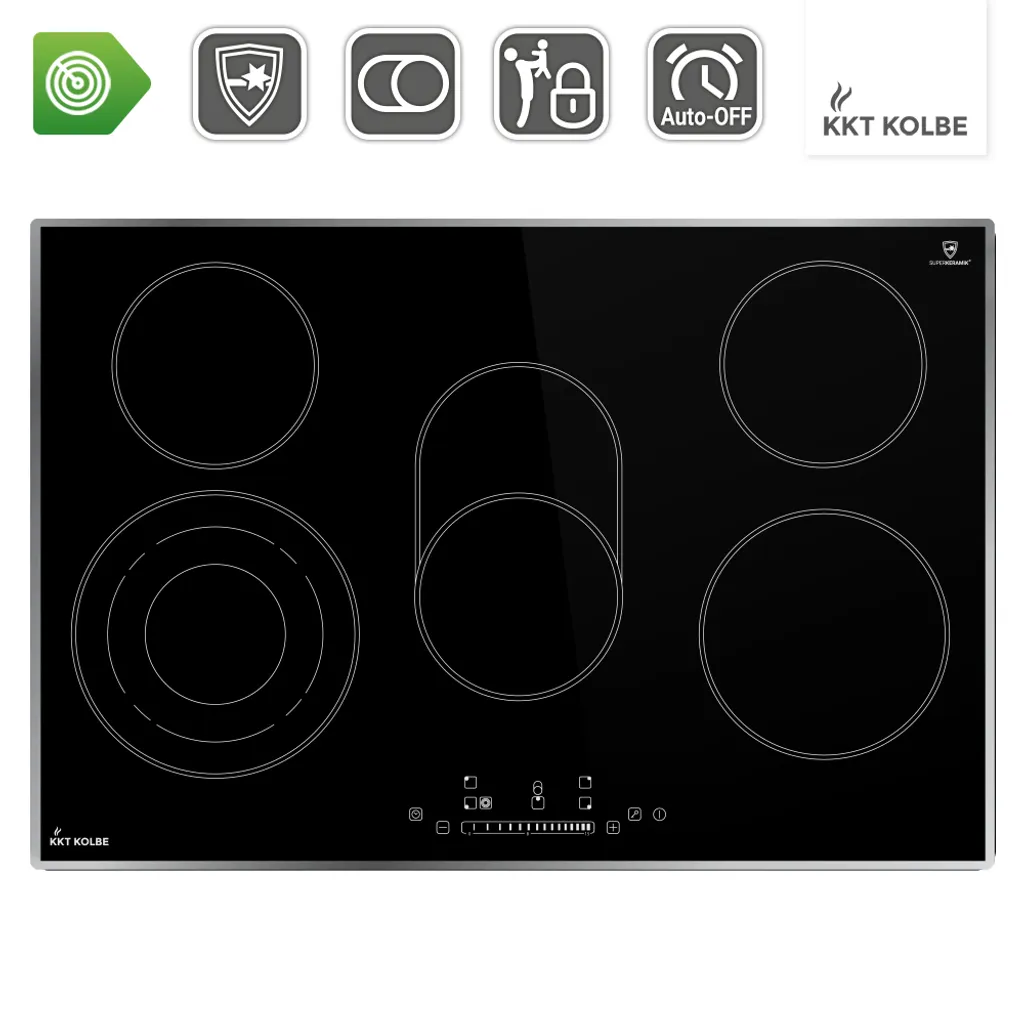 Das KKT KOLBE Heizspiralen-Kochfeld überzeugt durch eine hochwertige Verarbeitung und Funktionalität. Das Kochfeld verfügt über 5 Kochzonen. Die Dual-Kochzone und Bräterzone haben jeweils zwei Kochstellen, so dass Sie den einen zentralen separat und zusammenhängend mit dem jeweiligen äußeren Abschnitt benutzen können. Alle Kochzonen verfügen über 15 Schaltstufen mit der Möglichkeit die Hitze konstant abzugeben. Herkömmliche Intervall- bzw. Heizphasen entfallen somit und Sie können Ihre Lebensmittel gleichmäßig Kochen und Braten. Die Oberfläche aus hochwertiger SUPERKERAMIK®-Glaskeramik sorgt für Qualität und Sicherheit und ist einfach zu reinigen. Das Gerät kann mittels TouchSelect Sensortasten bequem bedient werden. Mit dem Slider des Bedienpanels können Sie mit einem Wisch die Temperaturstufe der Kochplatten einstellen. Mit der Timer-Funktion können Sie Kochzonen zeitgesteuert abschalten. Die LED-Anzeige zeigt alle wichtigen Informationen bequem auf einen Blick. Ein eingebauter Sensor überwacht die Temperatur, um Schäden zu vermeiden. Das Kochfeld schaltet sich dadurch bei zu hoher Temperatur automatisch ab.