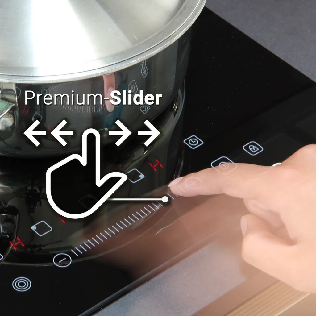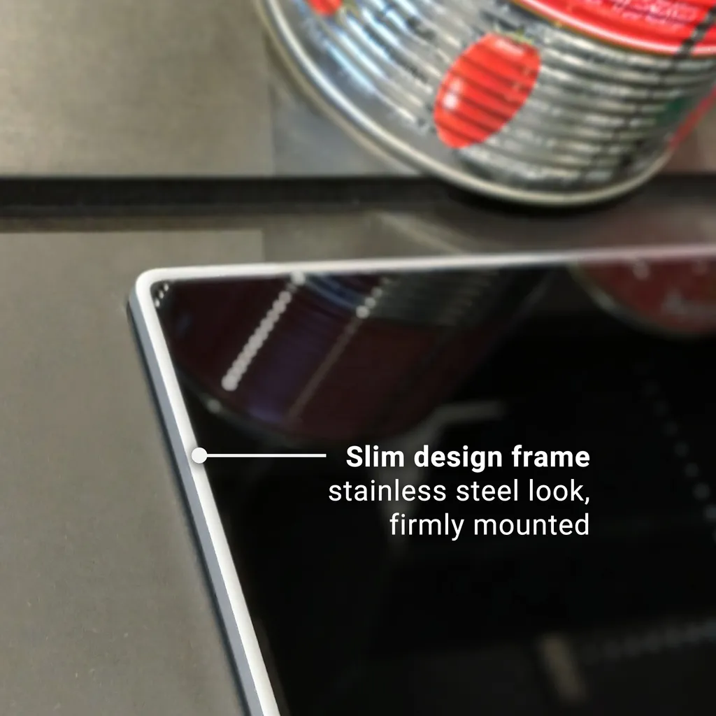 Der fest montierte Edelstahlrahmen sieht nicht nur gut aus, sondern schützt ihr Kochfeld auch vor Beschädigungen an den Kanten. Die Breite des Kochfelds beträgt 77cm und eignet sich für geräumige Küchen. Das Gerät ist autark, kann also unabhängig von anderen Geräten in Ihre Küche eingebaut werden.