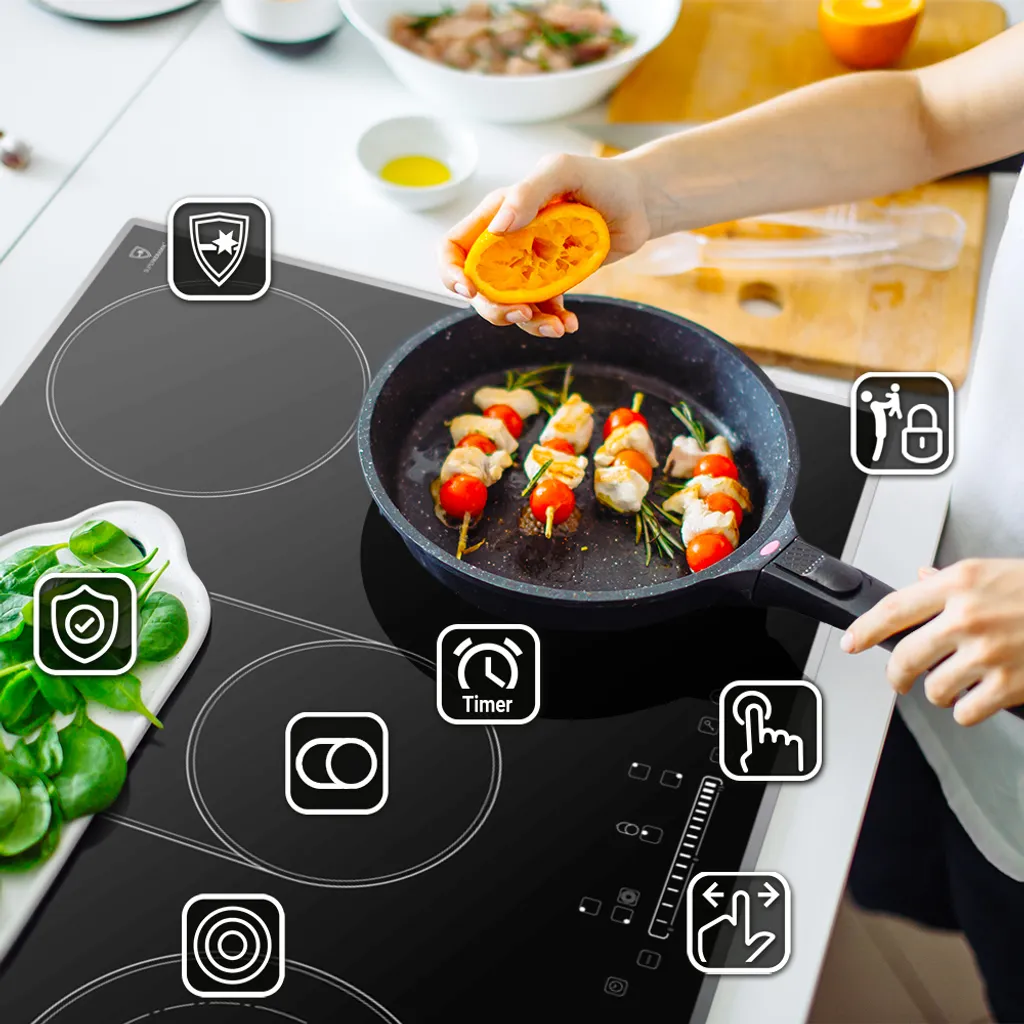 Falls eine Kochzone noch heiß ist, werden Sie von einer LED-Lampe davor gewarnt. Das Gerät ist mit einer Kindersicherung ausgestattet.