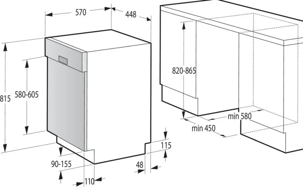 - Tiefe der Nischengröße für die Installation min.: 580 mm